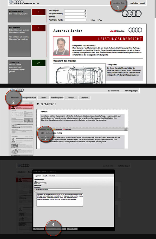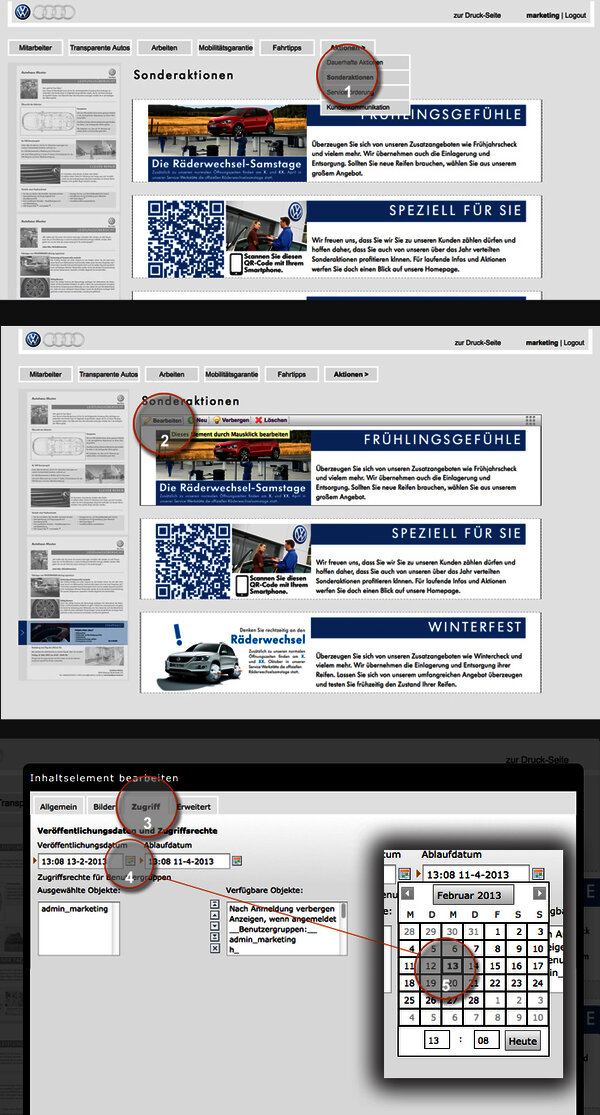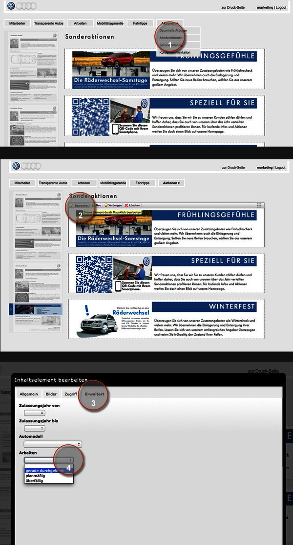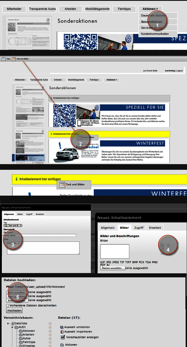 Unter dem Menüpunkt „Admin-Seite“ gelangen Sie zu Ihrer betriebsindividuellen Seite. Hier haben Sie die Möglichkeit, unter dem Menüpunkt „Aktionen“ ihre betriebseigene Aktion einzustellen. Wo diese Aktion eingestellt wird, bestimmen Sie, indem Sie zwischen „Dauerhafte Aktion“, Serviceföderung“, „Kundenkommunikation“ und „ Sonderaktion“ wählen. Wenn Sie den Ort der Aktion festgelegt haben, klicken Sie bitte auf der Seit oben rechts auf „Text und Bilder“. Sobald Sie diesen anklicken erscheint im Aktionsbereich der Hinweis „Inhaltselement einfügen“. Ziehen Sie den Button auf dieses Feld (Drag and Drop). Sobald es gelb wird, lassen Sie die Maus los. Nun steht Ihnen Ihr neues Inhaltselement zur Verfügung. Gehen Sie nun mit der Maus auf das erstellte Inhaltselement. An der oberen Kante erscheint eine Bearbeitungsleiste. Klicken Sie auf den Button „bearbeiten“. Durch ein Popup Fenster öffnet sich nun Ihr Inhaltselement. Betiteln Sie als erste die Aktion in dem Feld „Überschrift“, dann legen Sie in „Text“ den Text fest. Anschließend wählen Sie in der Kartei „Bilder“ oben rechts aus. Klicken Sie auf das Ordnersymbol. Es öffnet sich ein weiteres Popup-Fenster. Wählen Sie zunächst durch anklicken der „Aktionen“ den Ort aus, wo das Bild gespeichert werden soll. Jetzt können Sie Ihr betriebseigenes Bild laden. Klicken Sie den Button „durchsuchen“ und wählen Sie in Ihren betriebsinternen Dateien ein geeignetes Bild. Klicken Sie auf „öffnen“ und anschließend in Ihrem Popup-Fenster auf „hochladen“. Sobald das Bild geladen ist, finden Sie es rechts unten im Popup-Fenster. Hier finden Sie auch die vom AUDI/VW Marketing vorgegebenen Bildkampagnen, von denen Sie sich ebenfalls Bilder aussuchen können. Klicken Sie nun Ihr gewünschtes an. Gehen Sie in Ihrem Inhaltselement auf „speichern“. Sie finden nun in der Leistungsübersicht und dem gewählten Aktionsbereich Ihre Aktion mit Text und Bild, die Sie nun für die Leistungsübersicht verwenden können.