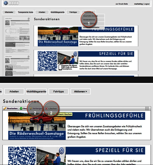 1. Die Abteilung SMW (VW/Audi Service) stellt Ihnen verschiedene Bilder zur Verfügung. Wenn Sie Ihre "Aktion erstellen" (siehe Punkt individuelle Aktionen), gelangen Sie unter "Bilder" und einem weiteren Klick auf das Dateisymbol "Datei hochladen" zum Medienarchiv. Unter "Aktionen" finden Sie alle geeigneten Bilder.
